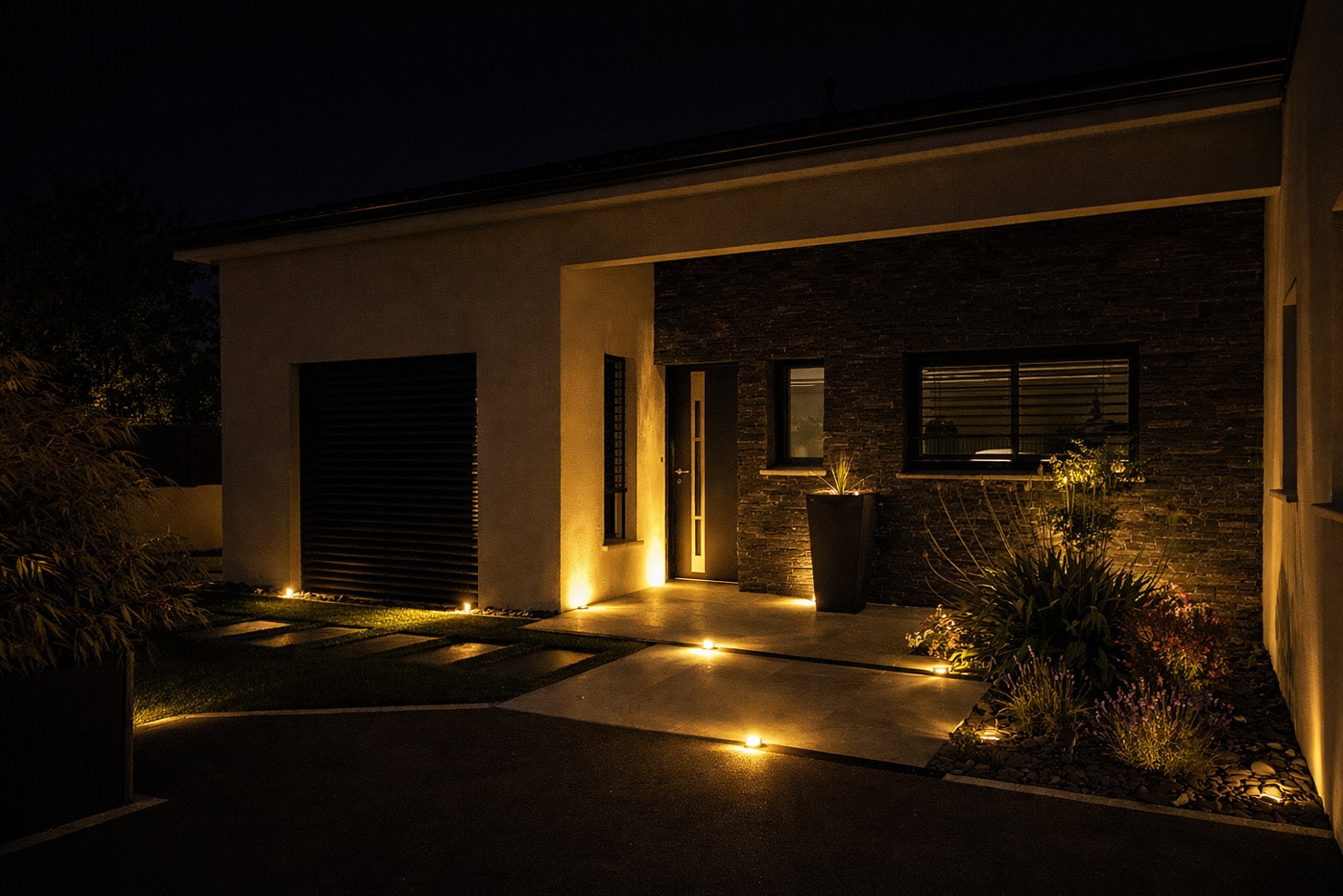 Grâce à un éclairage adapté, le jardin devient une véritable extension de la maison. Terrasse, pergola ou coin détente restent pleinement utilisables après la tombée de la nuit, transformant l’extérieur en une pièce à vivre supplémentaire.