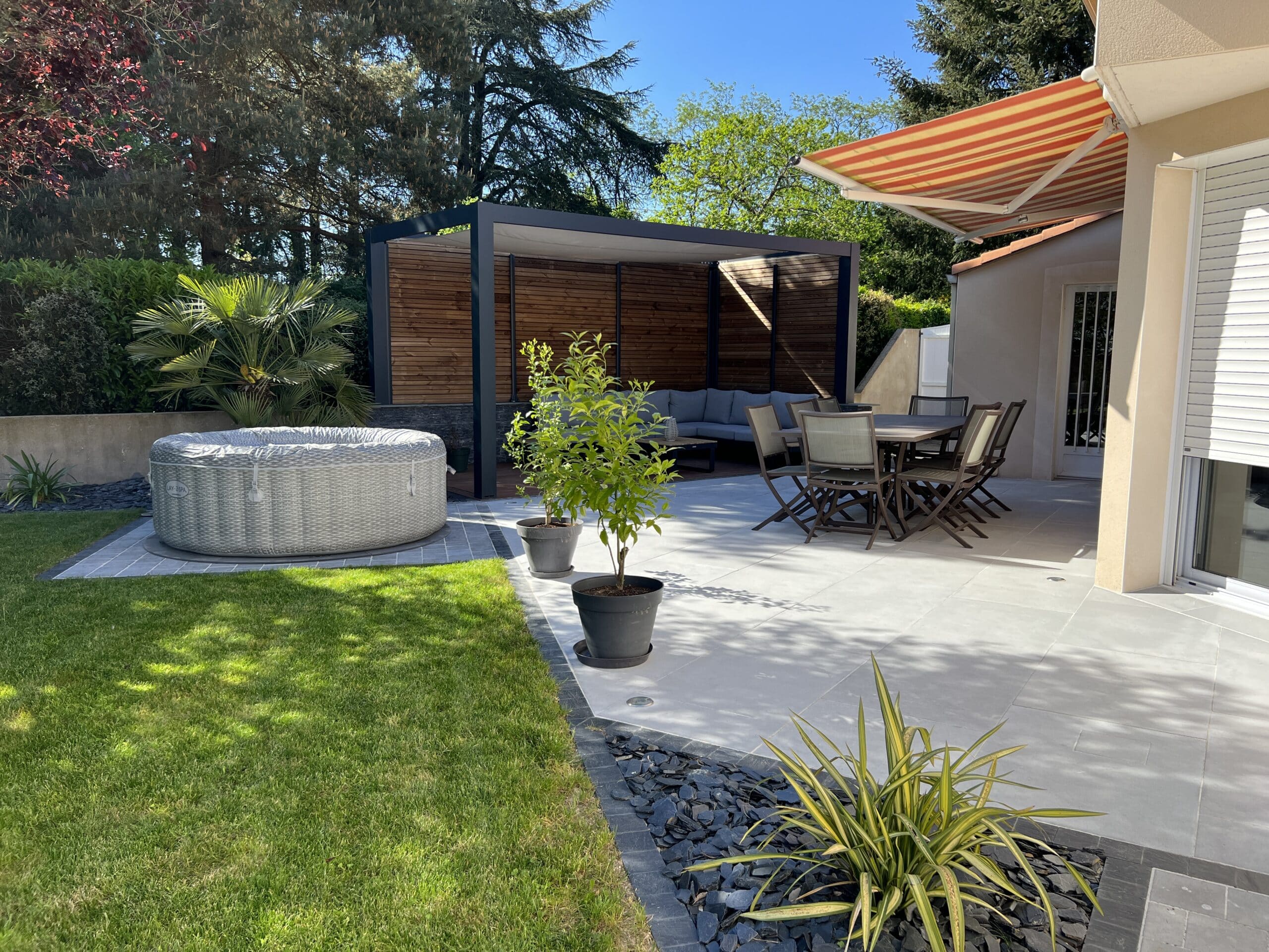 Cet aménagement sur-mesure a permis d’optimiser la circulation, de redonner de la structure au jardin et de créer une ambiance conviviale, adaptée aux usages du quotidien.
